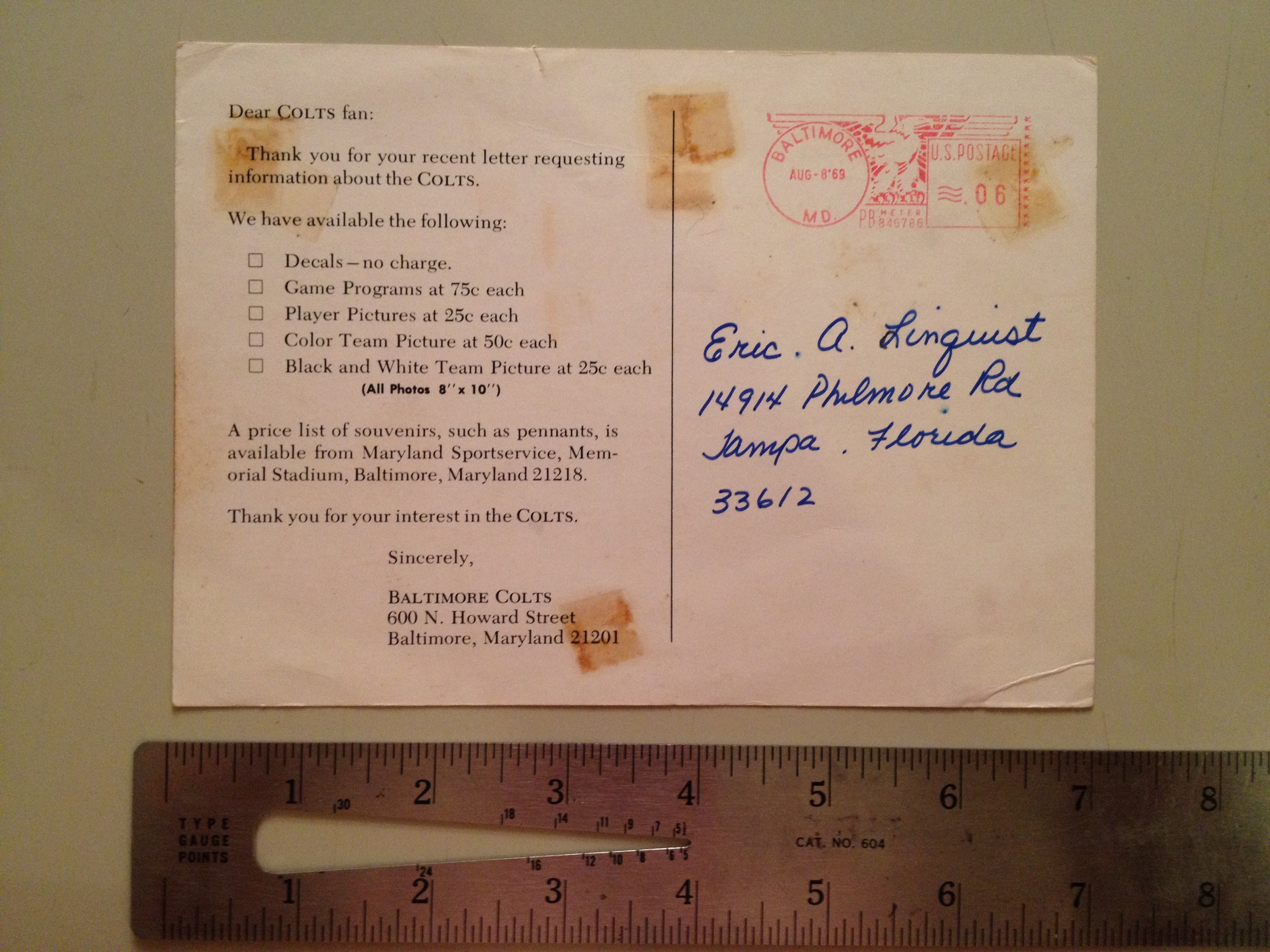 Washington Redskins - 1969 Team Sent Copies of Player Signatures - 1969 Pocket Game Schedule - Merchandise Listings with Envelope carrying Provenance Postmark of Sep 18, 1969